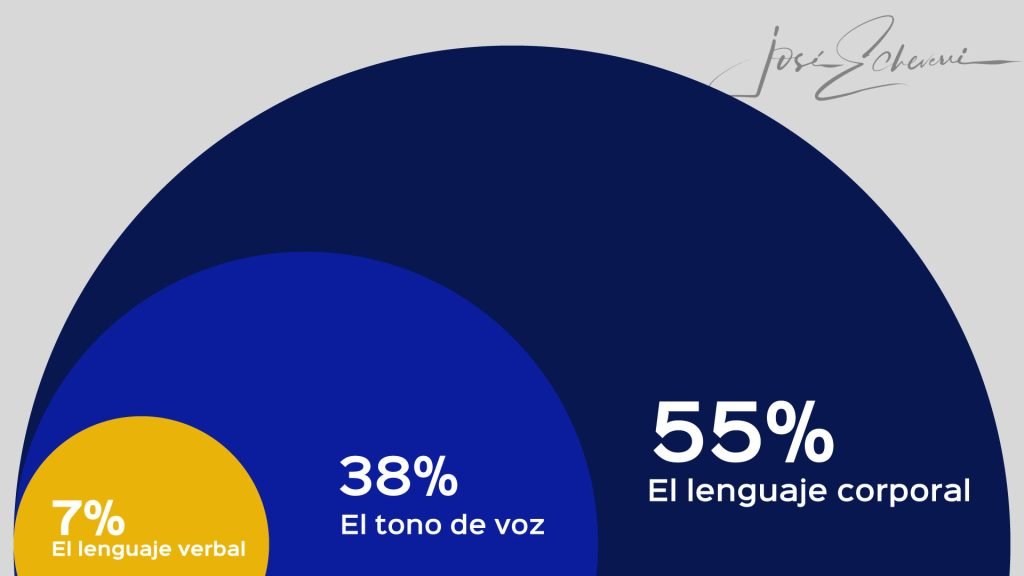 Recordemos también que, en el proceso comunicativo, el lenguaje corporal influye en un 55%, el tono de voz en un 38%, y el lenguaje verbal solamente en un 7%, por lo cual debemos cuidar no solo lo que decimos sino la forma en que lo expresamos y lo que transmitimos con nuestros gestos y nuestro cuerpo.